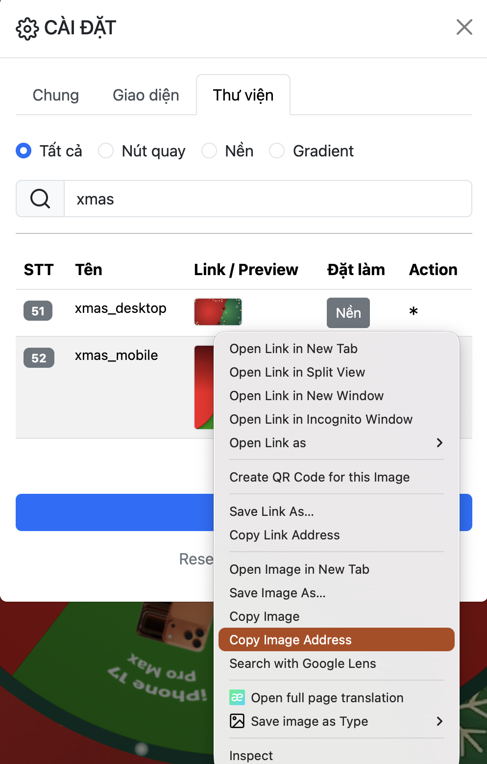Tại trang chủ Vòng quay may mắn, truy cập Cài đặt → Thư viện và gõ từ khóa xmas.
